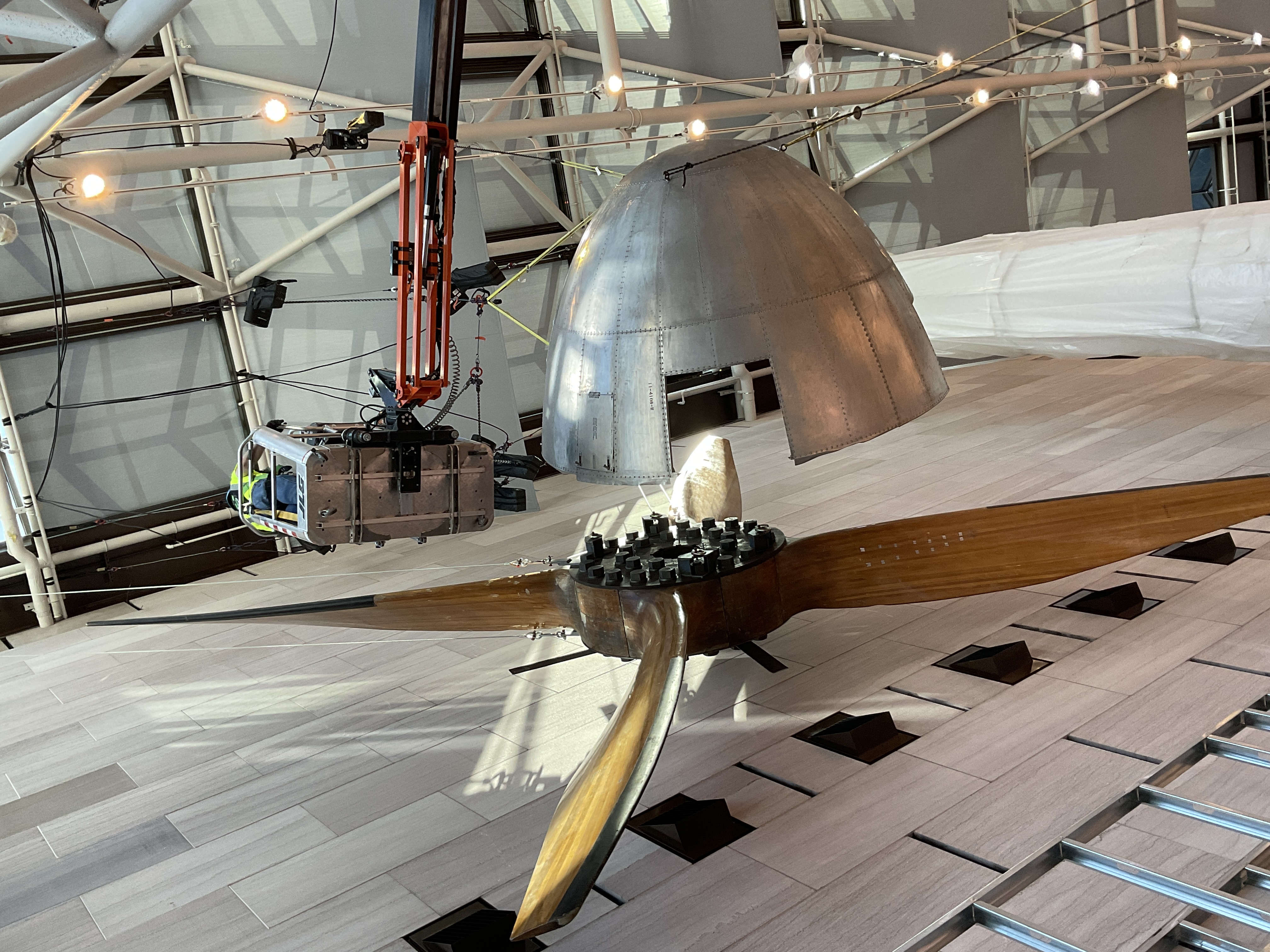 Museum staff and contractors carefully reattached the fan assembly’s aluminum nose cone to the steel hub and wooden blades in mid-air.