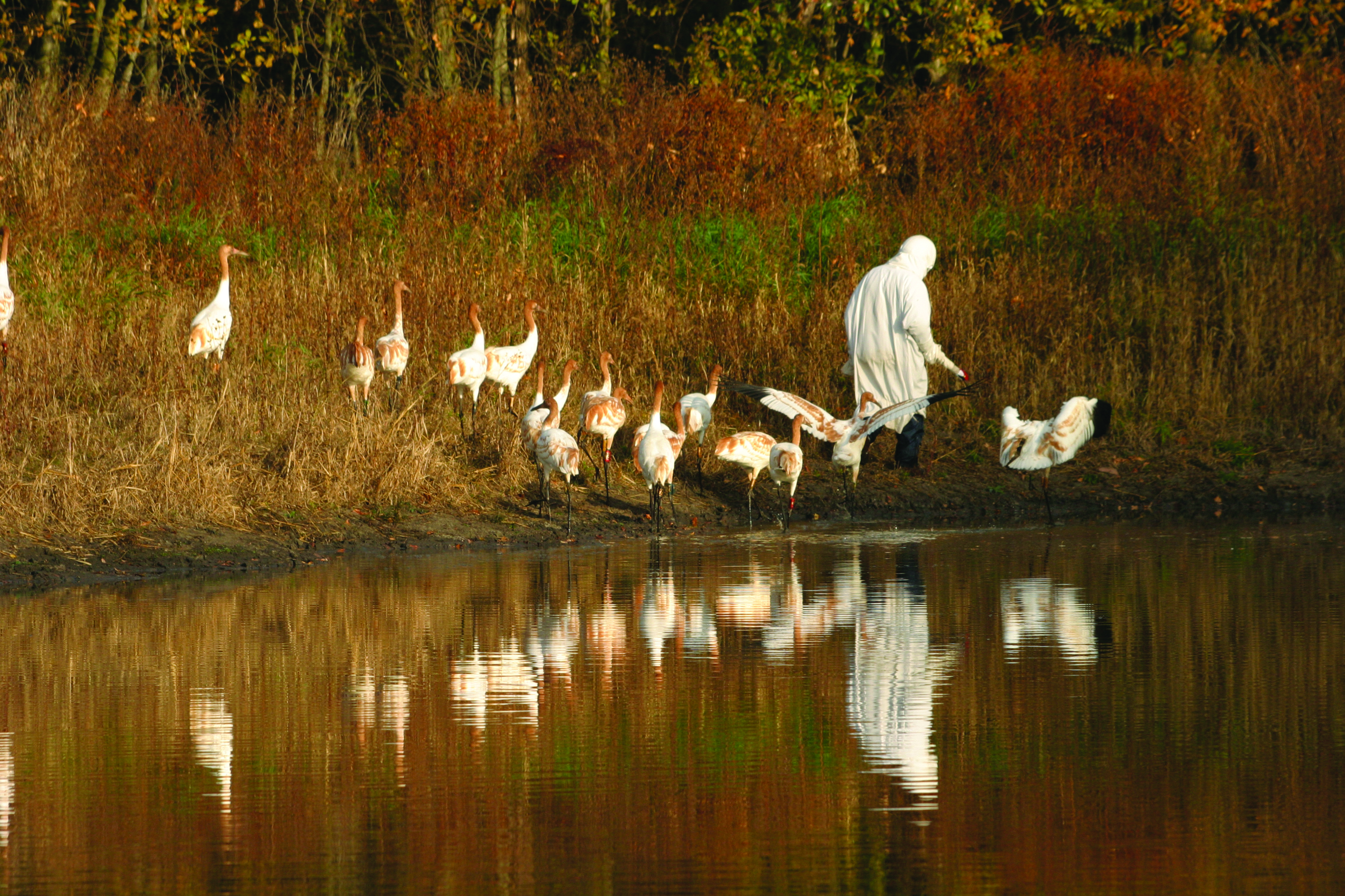 Crane chicks identify with whoever raises them. So aviculturists dressed in costumes, and used hand puppets that looked like adult cranes. That way, when released to nature, the young birds would recognize other cranes—rather than people—as their own kind.