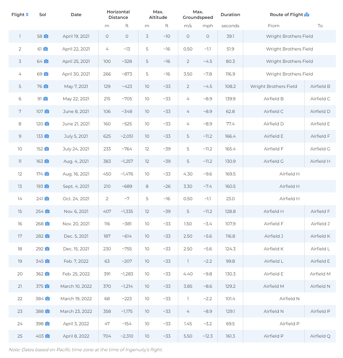 Ingenuity’s flight log as of April 8, 2022. (Courtesy of NASA)