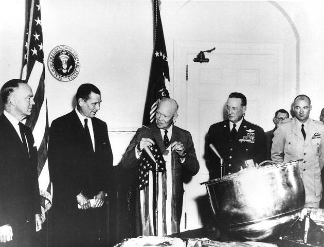 President Dwight D. Eisenhower with a successfully retrieved Corona capsule.