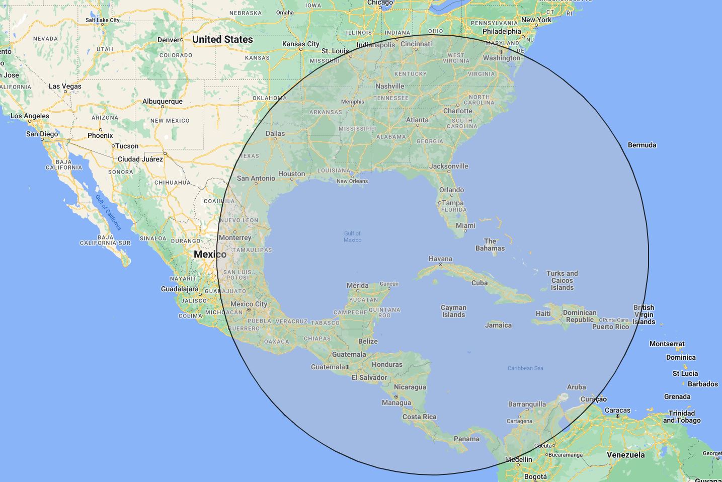 This map approximates the reach of intermediate range missiles from Cuba during the Cuban Missile Crisis.