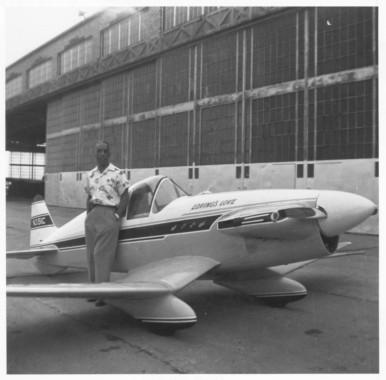 Neal loving poses next to his Loving-Wayne WR-1 "Loving's Love" (r/n N351C) aircraft circa late 1950s to early 1960s.