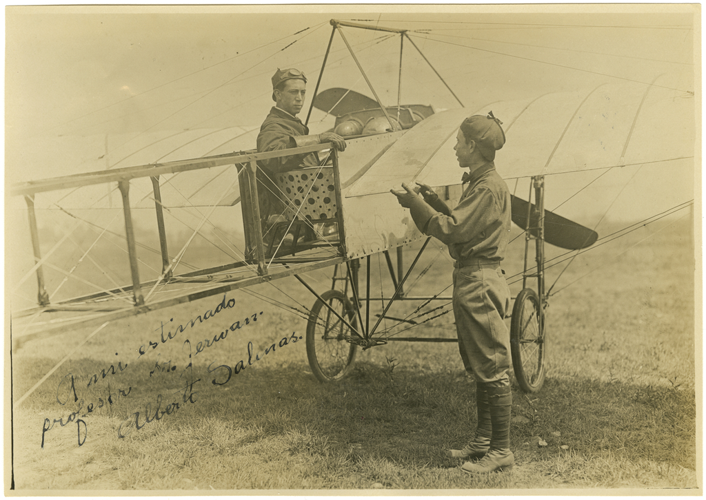 Mexican aviator Gustavo Salinas Camiña seated at the controls of a Moisant (Co) 1911 Monoplane (Blériot Type) on the ground (one-half right rear view, close in); his cousin, Alberto Salinas Carranza, stands beside the airplane, speaking to him. Probably at Hempstead, Long Island, New York, circa 1912. Inscribed in Spanish and autographed at lower left: "A mi estimado professor Sr. Jerwan. Alberto Salinas" [To my esteemed teacher Mr. {Shakir} Jerwan, Alberto Salinas]. NASM-9A18697-041B