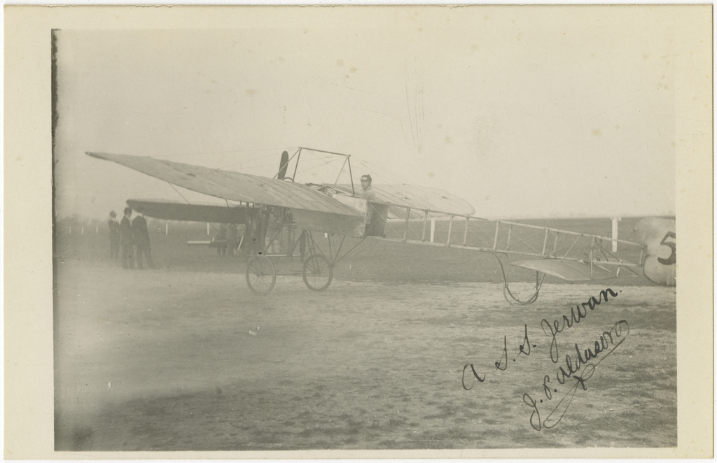One-half left rear view of Moisant (Co) 1911 Monoplane (Blériot Type, Race No. 5) on the ground, Juan Pablo Aldasoro seated at the controls; probably Long Island, New York, circa 1912-1913. Inscribed in Spanish and autographed at lower right: "A S. S. Jerwan; J. P. Aldasoro." [To {Shakir} S. Jerwan; J. P. Aldasoro.] NASM-9A18697-052A