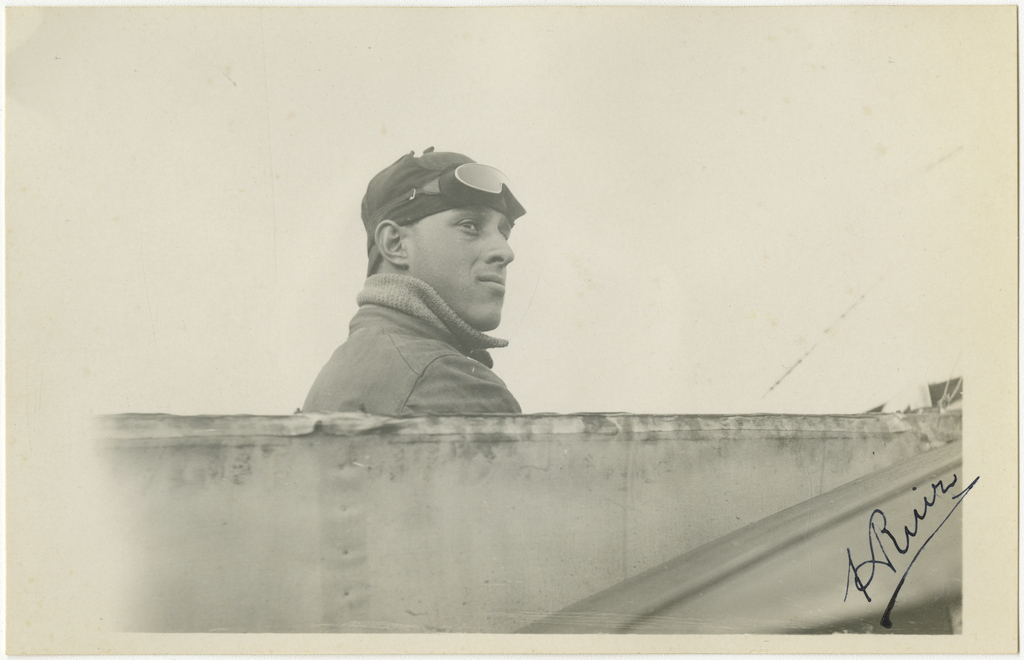 Right side view, close up, of pilot Horacio Ruiz seated at the controls of a Moisant (Co) 1911 Monoplane (Blériot Type) on the ground, probably at Hempstead, Long Island, New York, November 6, 1912. Autographed "H Ruiz" at lower right corner. Printed as a post card addressed to Sr. S. S. [Shakir] Jerwan; inscription on reverse, "Como un recuerdo de gratitud a mi amable profesor. Garden City XI - 6 -912." [As a memory of gratitude to my kind teacher.] NASM-9A18697-052B