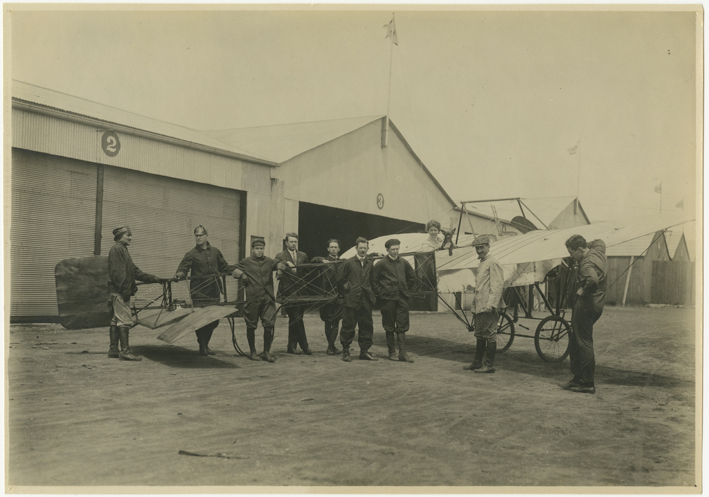 "The first class in 1912, Hempstead Plain, L. I." Student pilots at the Moisant School of Aviation, Hempstead, Long Island, New York, pose in front of Hangar 2 with a Moisant (Co) 1911 Monoplane (Blériot Type), May 1912; one-quarter rear right side view of aircraft. Left to right: 1, 2, unknown; 3, Alberto Salinas Carranza; 4, 5, 6, unknown; 7, Gustavo Salinas Camiña; 8, Bernetta Adams Miller (seated in cockpit with Jerwan's dog "Monoplane"); 9, Shakir S. Jerwan; 10, unknown. NASM-9A18697-061A
