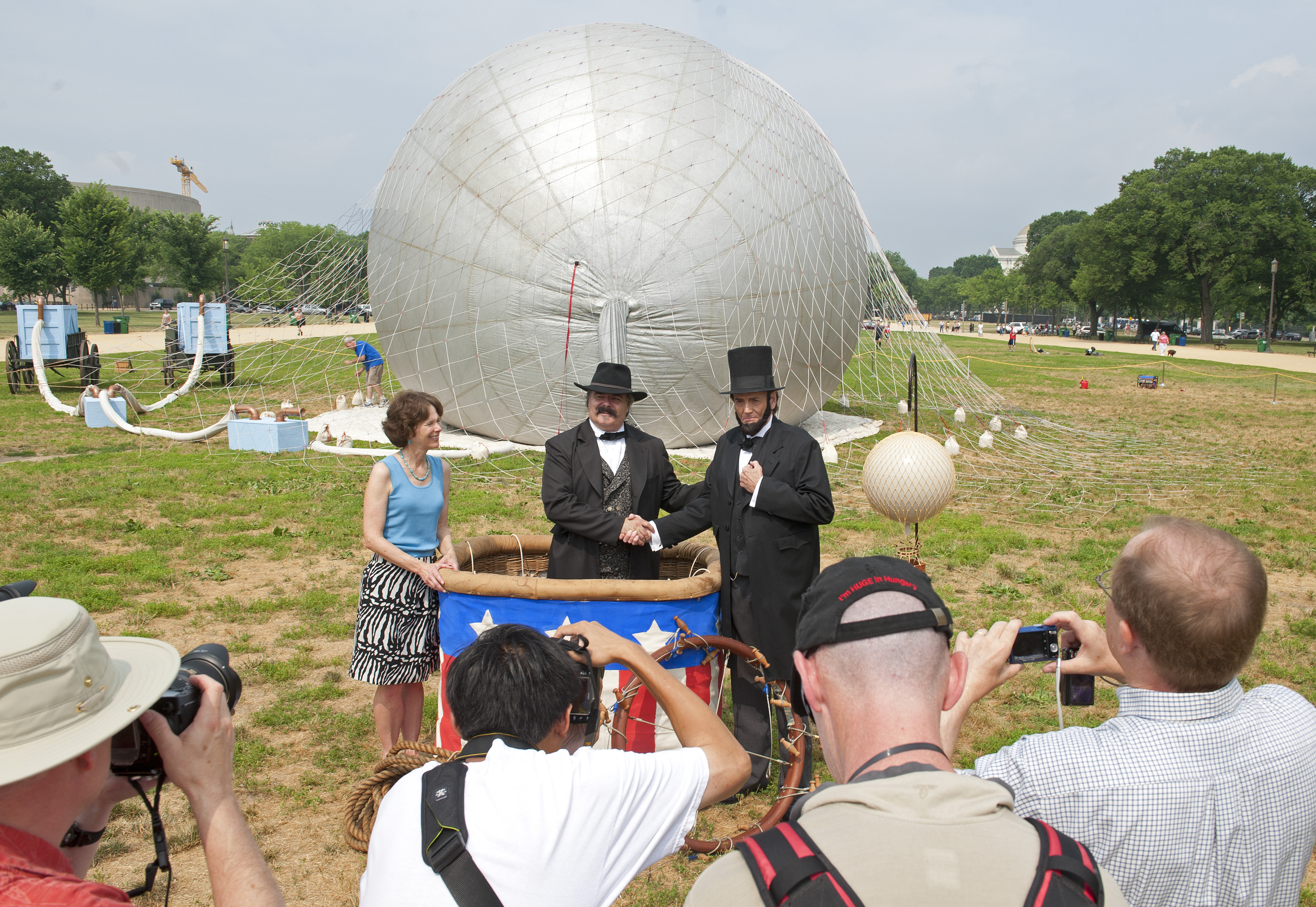 Spectators and onlookers witness the reenactment of the beginning of the Abraham Lincoln/Thaddeus Lowe collaboration in support of the Union Army at the "Mr. Lincoln's Air Force"Family Day in 2011. The event commemorated the 150th anniversary of Lowe's tethered ascent in a gas balloon, which attracted the support of President Lincoln and led to the creation of a balloon corps for the Union Army.