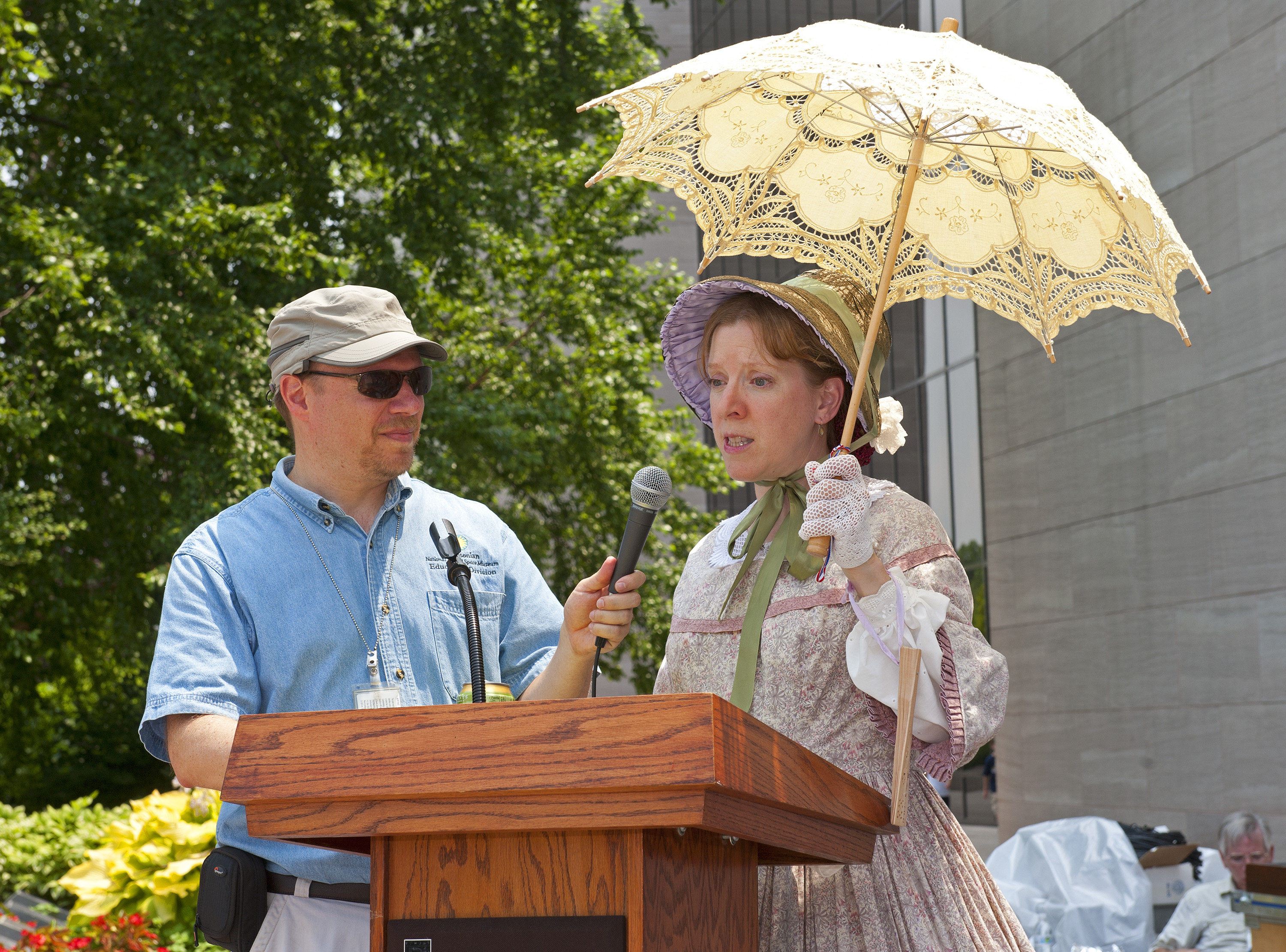A reenactor representing Mary Henry (daughter of the first secretary of the Smithsonian, Joseph Henry), relates her experiences of June 18, 1861 at the "Mr. Lincoln's Air Force" Family Day on June 11, 2011. The event commemorated the 150th anniversary of Lowe's tethered ascent in a hot-air balloon, which attracted the support of President Lincoln and led to the creation of a balloon corps for the Union Army.