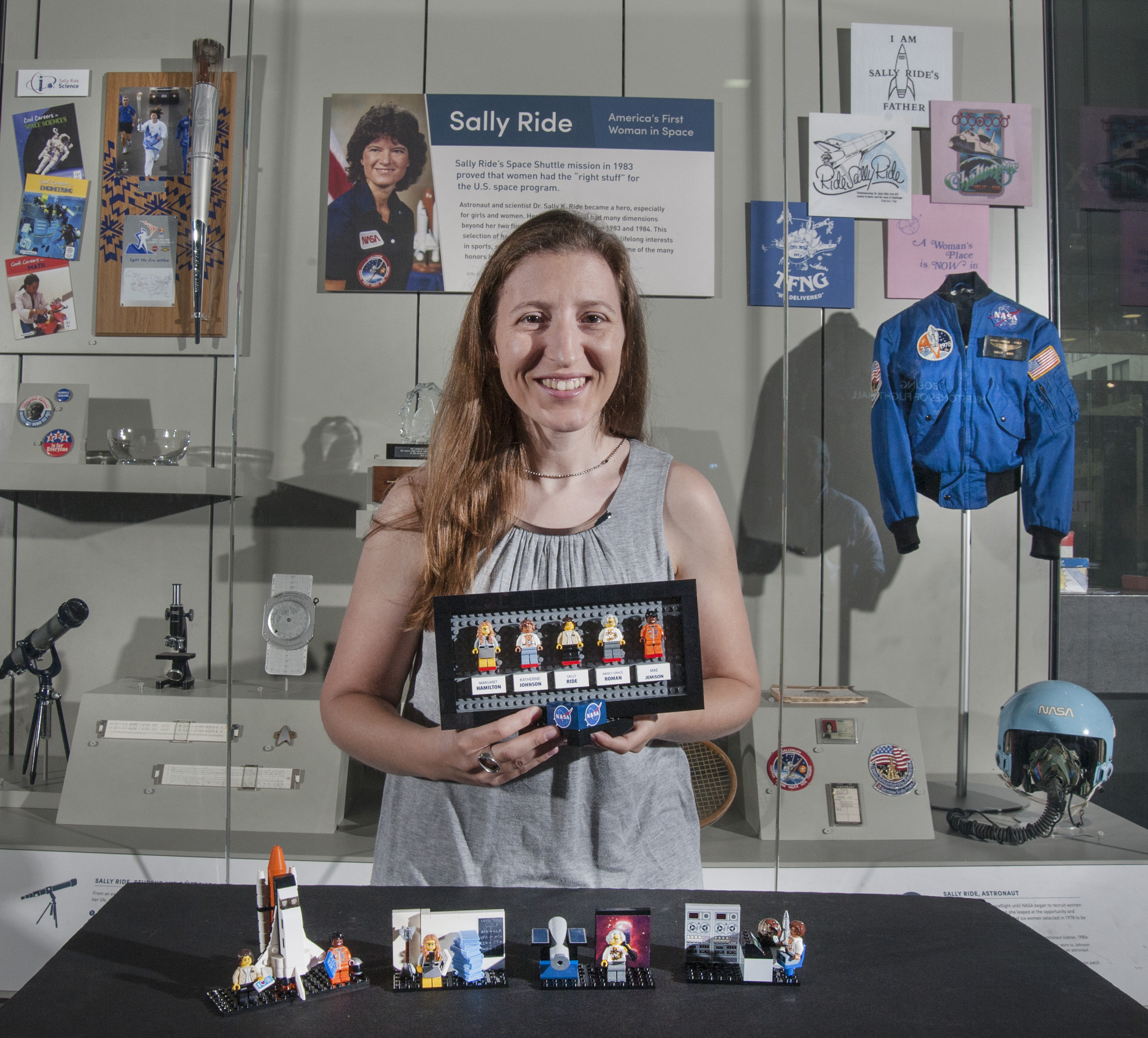 Maia Weinstock with her LEGO® set in front of a Sally Ride display case at the Smithsonian’s National Air and Space Museum in Washington DC. Weinstock donated the original prototypes for the LEGO® Ideas "Women of NASA" set to the Museum on August 20, 2018. Credit: National Air and Space Museum