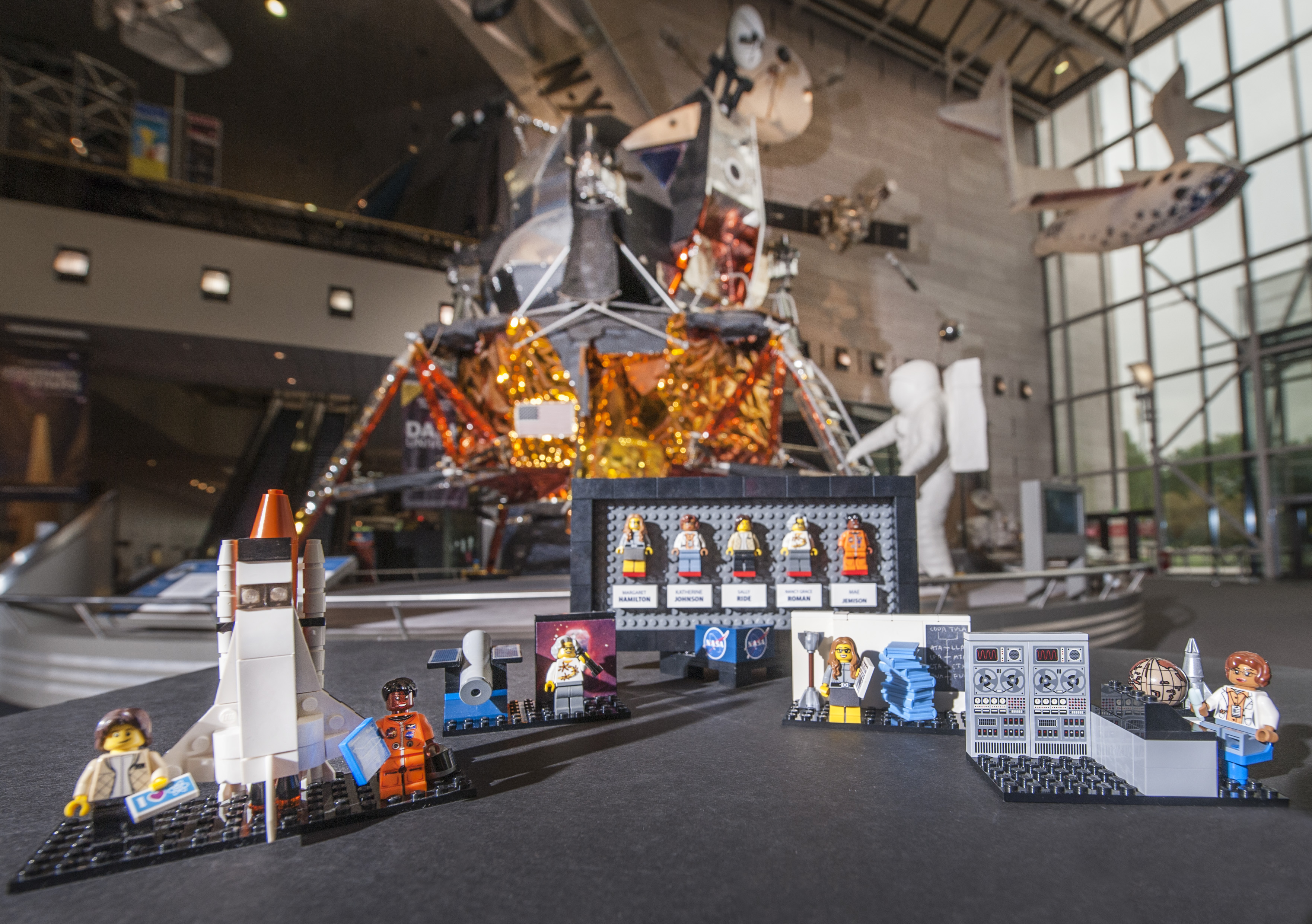 The original prototypes of the LEGO® Ideas "Women of NASA" set displayed in front of the Apollo Lunar Module in the Boeing Milestones of Flight Hall at the Smithsonian’s National Air and Space Museum in Washington, DC, August 20, 2018. Credit: National Air and Space Museum