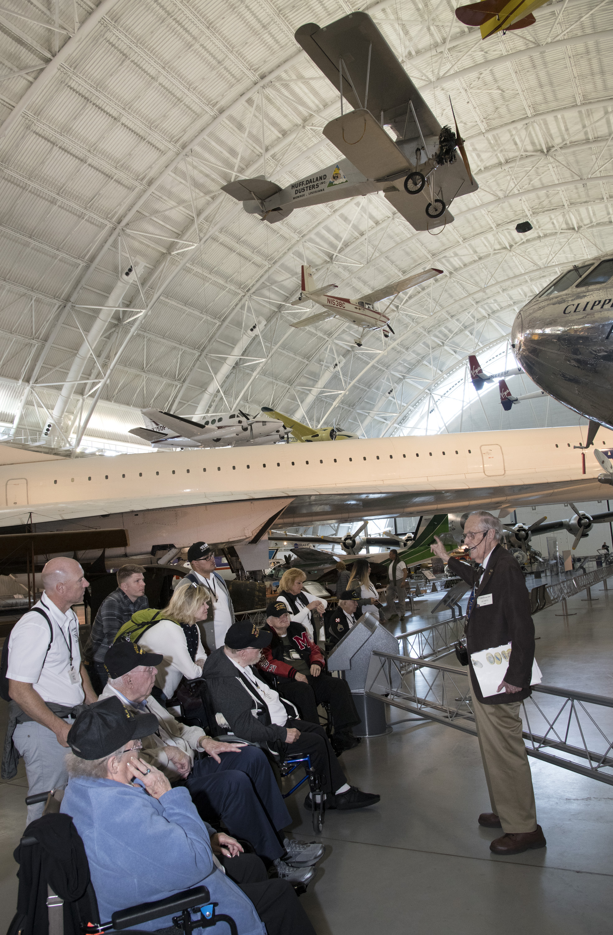 A group of veterans touring the Steven F. Udvar-Hazy Center in Chantilly, VA. This group is with the "Journey of Heroes" program, through Wish of A Lifetime. They were guided by Air and Space docent Lee Smith, is a WWII veteran himself. Credit: National Air and Space Museum