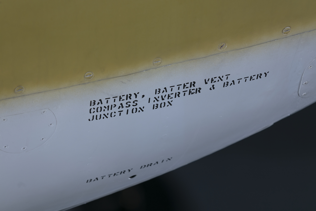 The XP-59A is the first American jet aircraft. It did not see combat, but it did give the U. S. Army Air Forces and the U. S. Navy valuable experience with jet aircraft technology and helped pave the way to more advanced designs. The United States was slow to enter the field of jet propulsion. Political and military leaders wisely chose to forego rushing jet airplanes into service and concentrated instead on mass-producing and fielding more conventional designs that could contribute more quickly to the war effort. Highlighted in this image is a label on of the Bell XP-59A Airacomet. Battery, battery vent compass inverter & battery junction box.