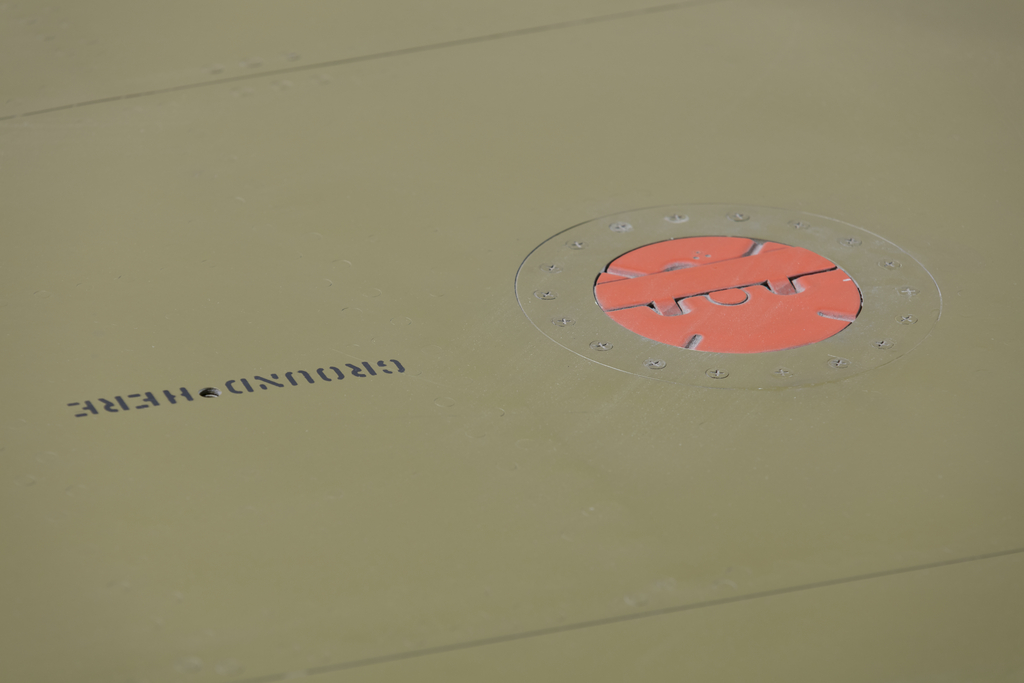 The XP-59A is the first American jet aircraft. It did not see combat, but it did give the U. S. Army Air Forces and the U. S. Navy valuable experience with jet aircraft technology and helped pave the way to more advanced designs. The United States was slow to enter the field of jet propulsion. Political and military leaders wisely chose to forego rushing jet airplanes into service and concentrated instead on mass-producing and fielding more conventional designs that could contribute more quickly to the war effort. Highlighted in this image is a label on of the Bell XP-59A Airacomet, which says Ground Here.