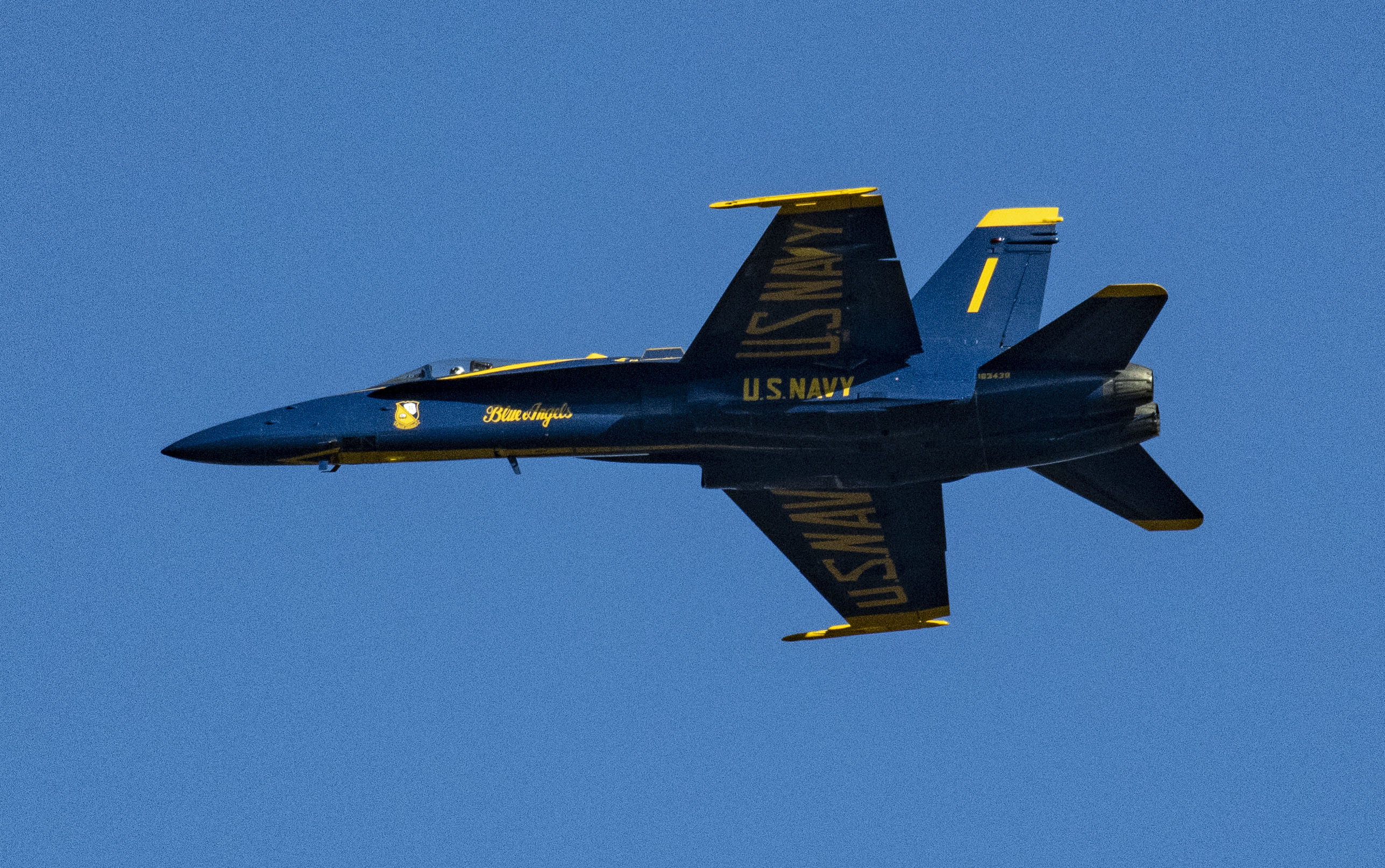A U.S. Navy Blue Angel F/A-18C Hornet, piloted by Cmdr. Frank Weisser, arrives at the Steven F. Udvar-Hazy Center in Chantilly, VA, November 18, 2020. Smithsonian's National Air and Space Museum is accessioning this aircraft into the collection. It was retired by the Navy at the end of the 2020 season as the demonstration team moves to the larger Super Hornet. This specific airplane flew with eight squadrons (including Strike Fighter Squadron (VFA) 86 during Operation Desert Storm, the First Gulf War, in 1991) before being turned over to the Blue Angels in 2015.