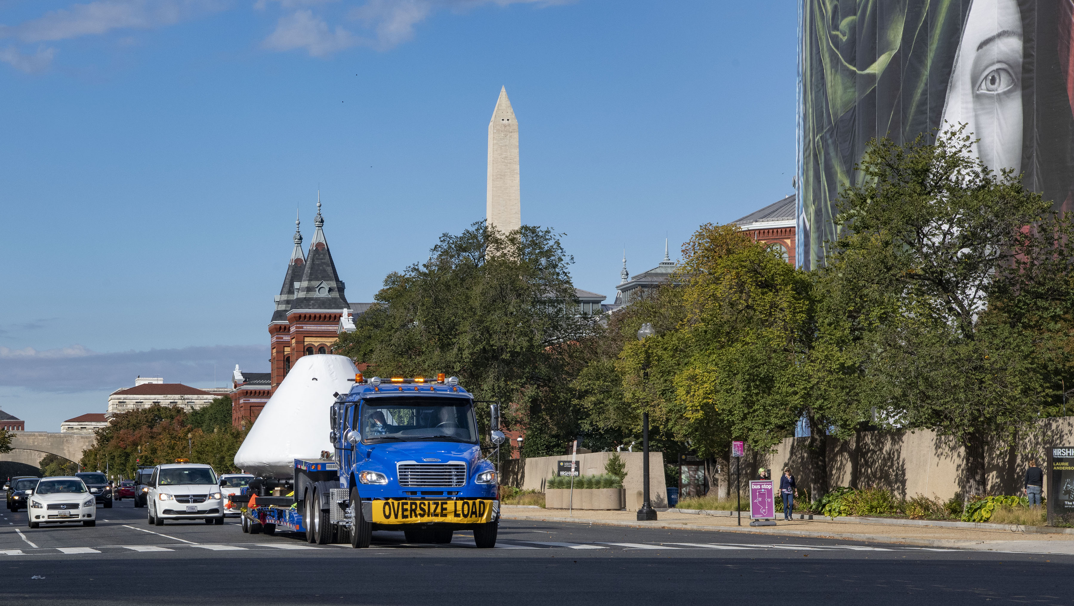 The Apollo 11 command module Columbia that transported Michael Collins, Buzz Aldrin, and Neil Armstrong to the Moon being transported to Museum on the Mall. (Smithsonian Institution)