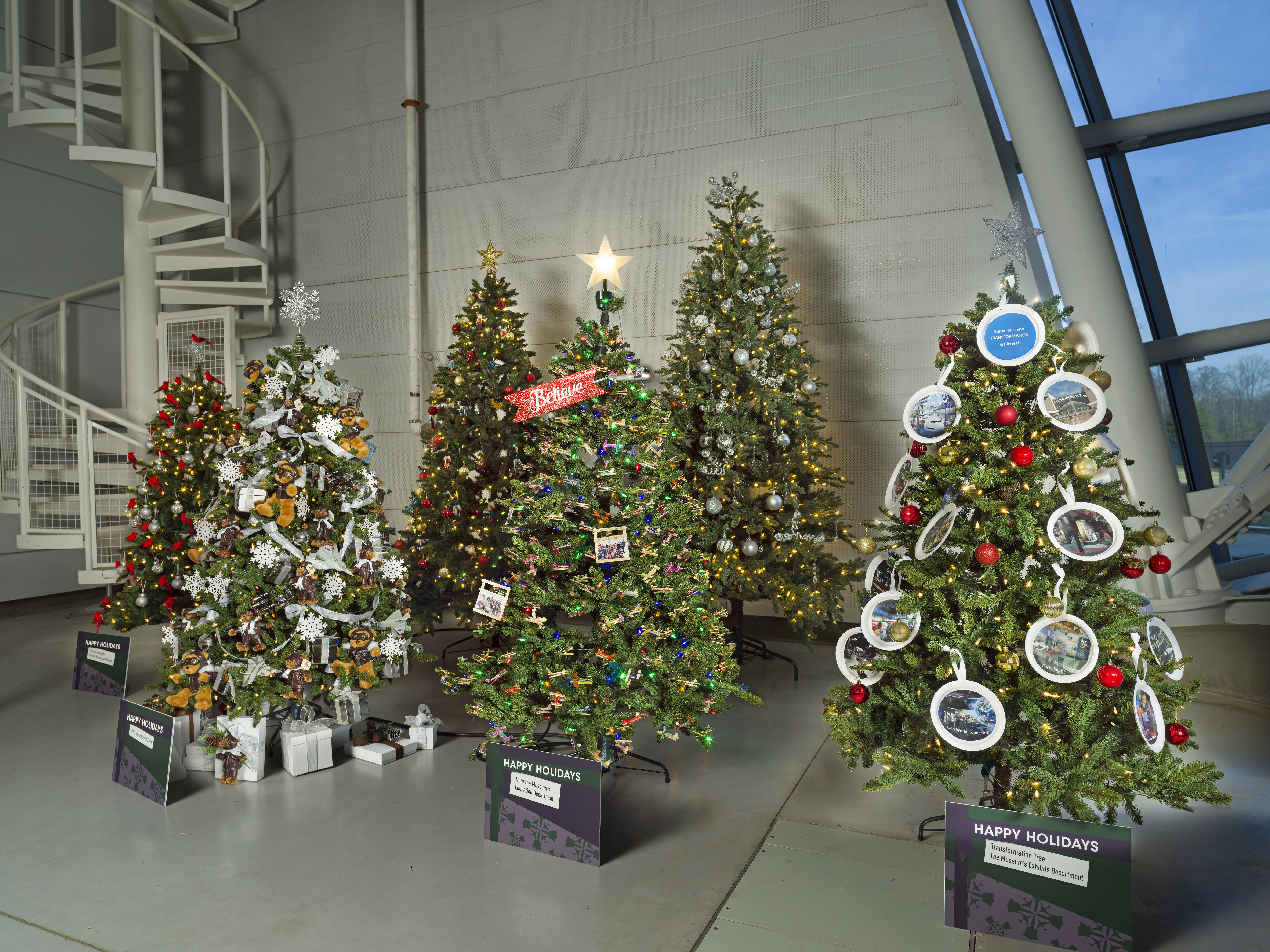 Holiday trees decorated as part of the Museum's Deck the Hangars initiative at the Steven F. Udvar-Hazy Center in December 2021.