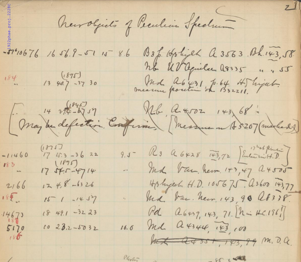 A page from one of Annie Jump Cannon’s 1922 notebooks featuring “New Objects of Peculiar Spectrum.” (Courtesy of Harvard (Image ID: phaedra2228))