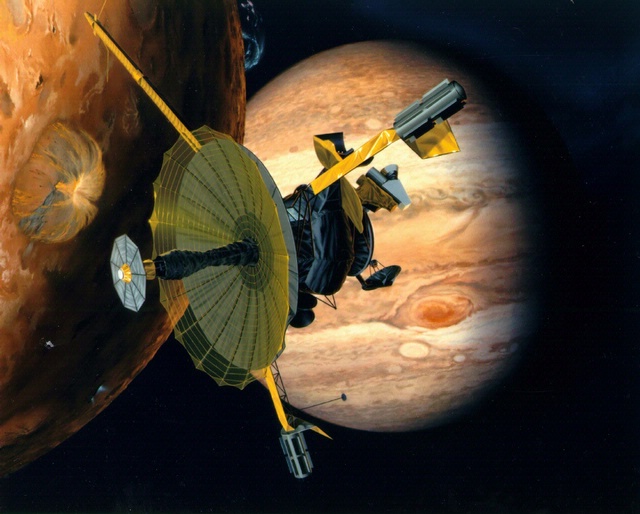 Artist's rendition of Galileo spacecraft encounter with Jupiter's moon Io.
