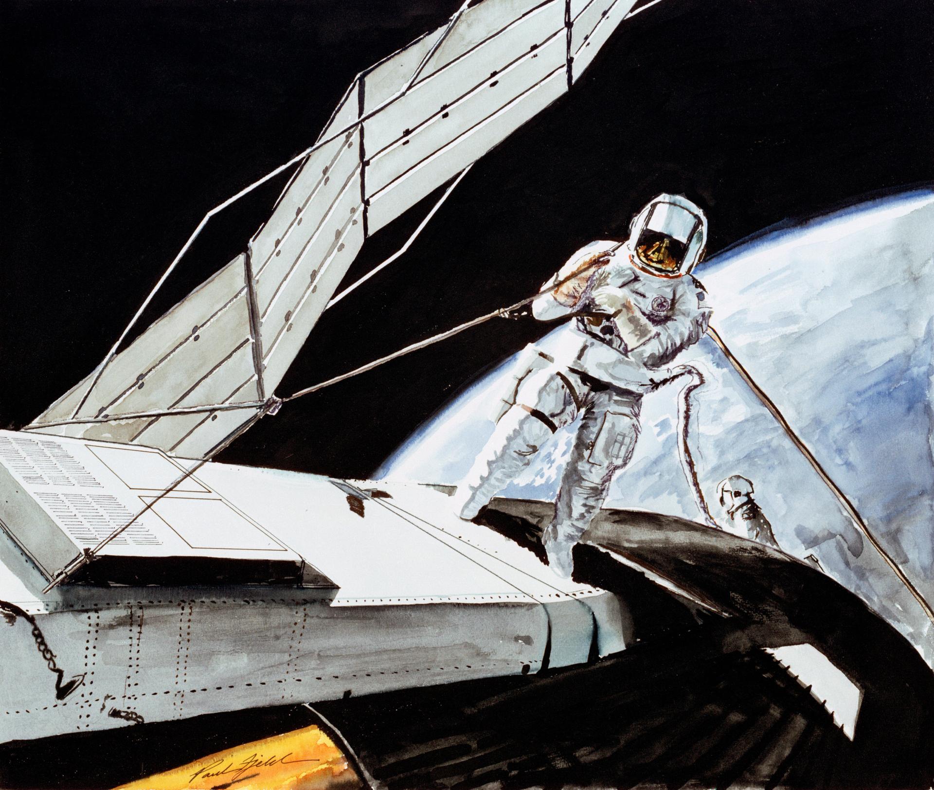An artist's concept showing astronaut Charles Conrad Jr., Skylab 2 commander, attempting to free the solar array system wing on the Orbital Workshop during extravehicular activity at the Skylab 1 & 2 space station cluster in Earth orbit. The astronaut in the background is Joseph P. Kerwin, Skylab 2 science pilot.