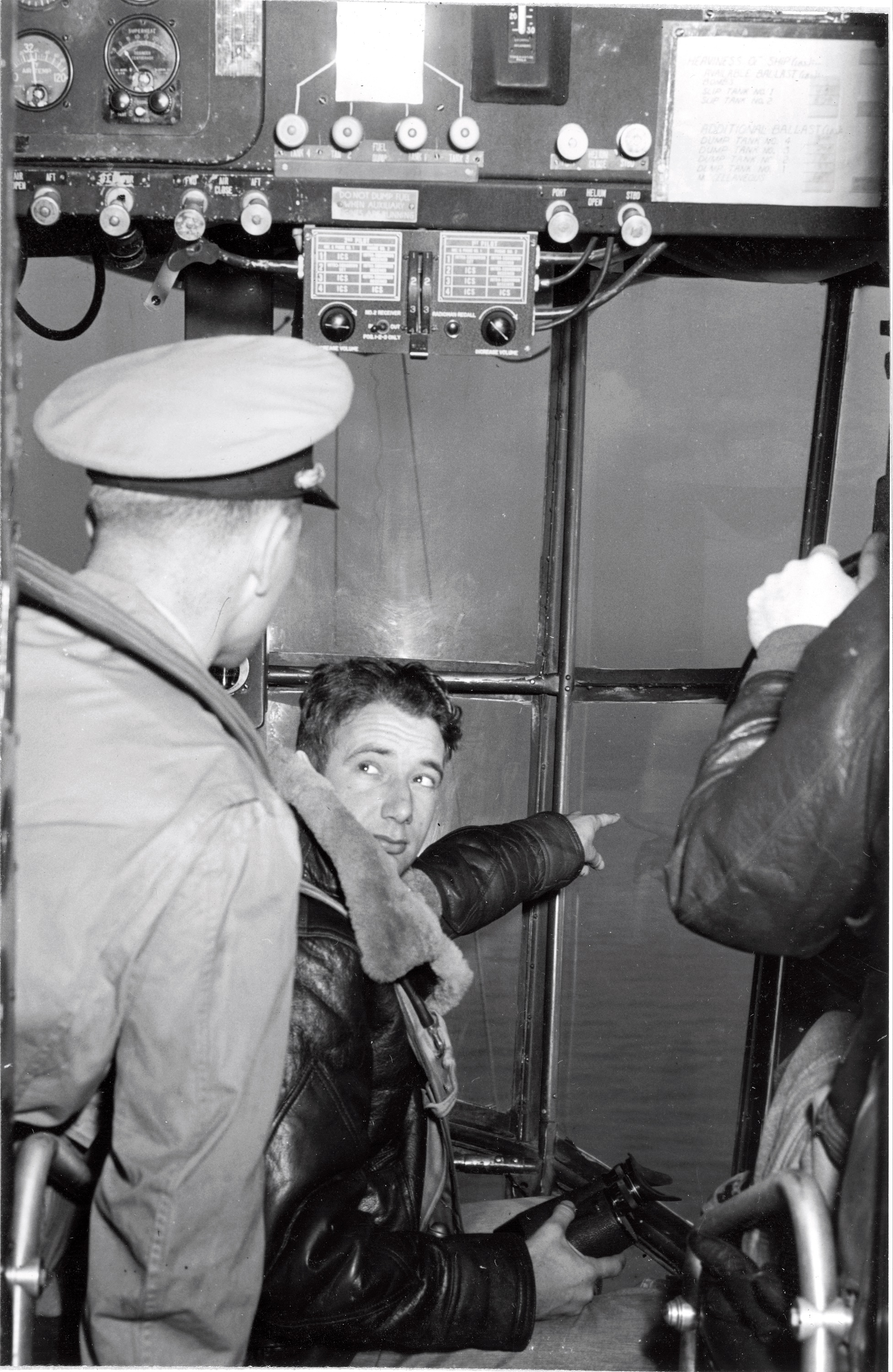 A crew member of K-28, U.S. Navy Airship Squadron 24 (ZP-24), spots a ship during a patrol. The large windows of the K-ship cabin provided a 180-degree view for search-and-rescue operations.