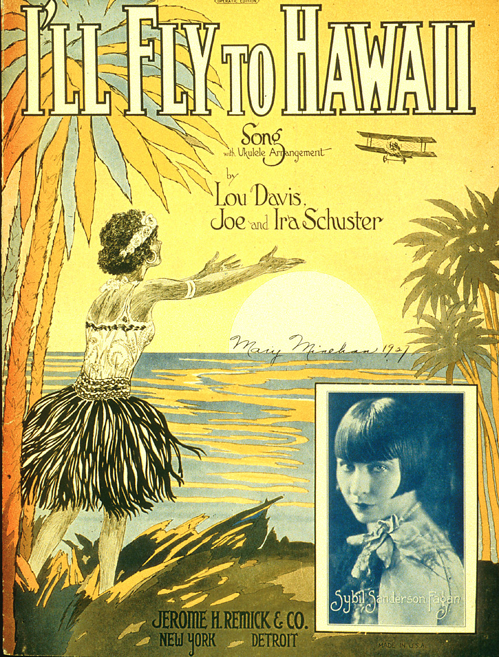 Sheet music cover for I'll Fly to Hawaii by Lou Davis and Joe and Ira Schuster.