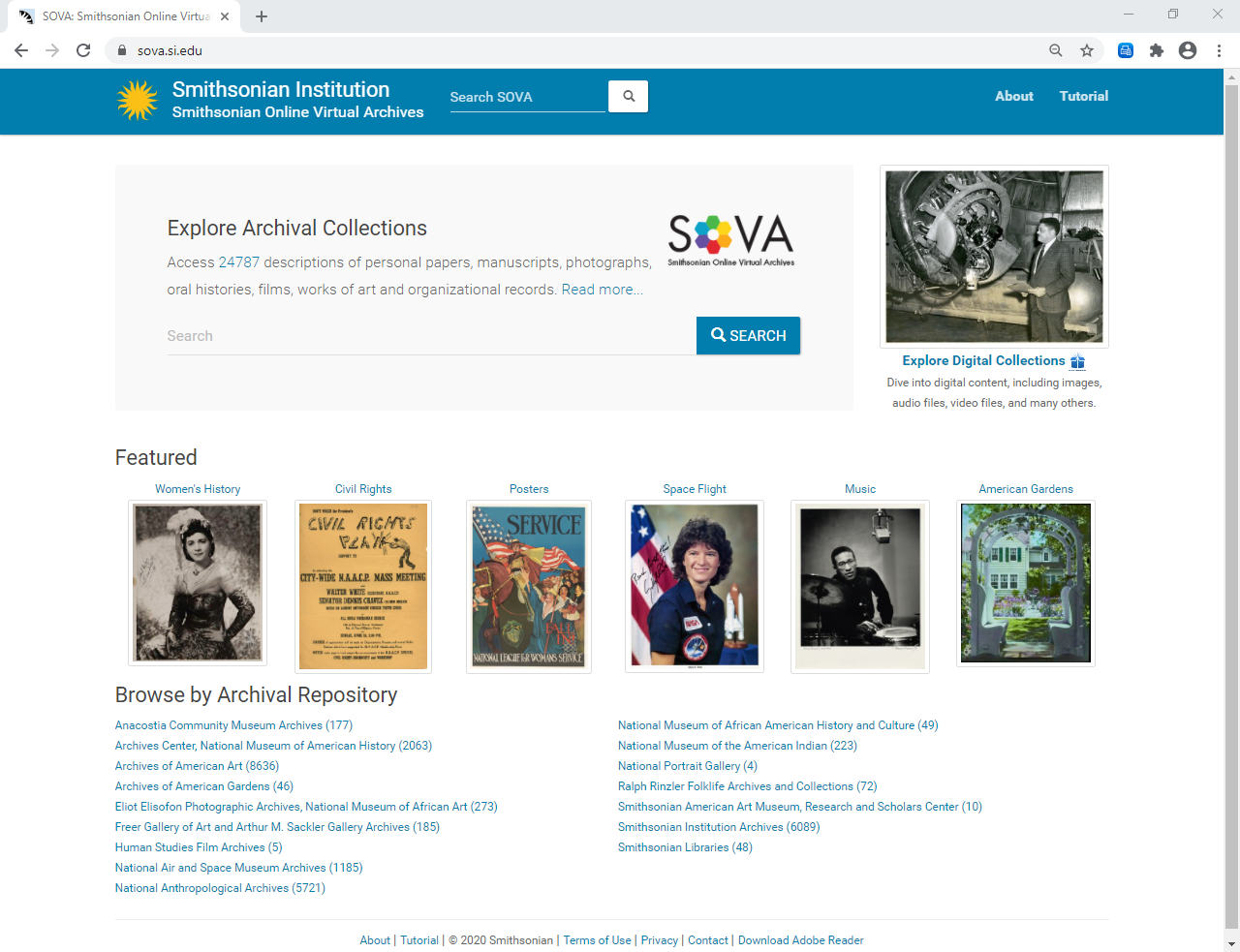 Screen capture of Smithsonian Online Virtual Archives (SOVA) Home Page.