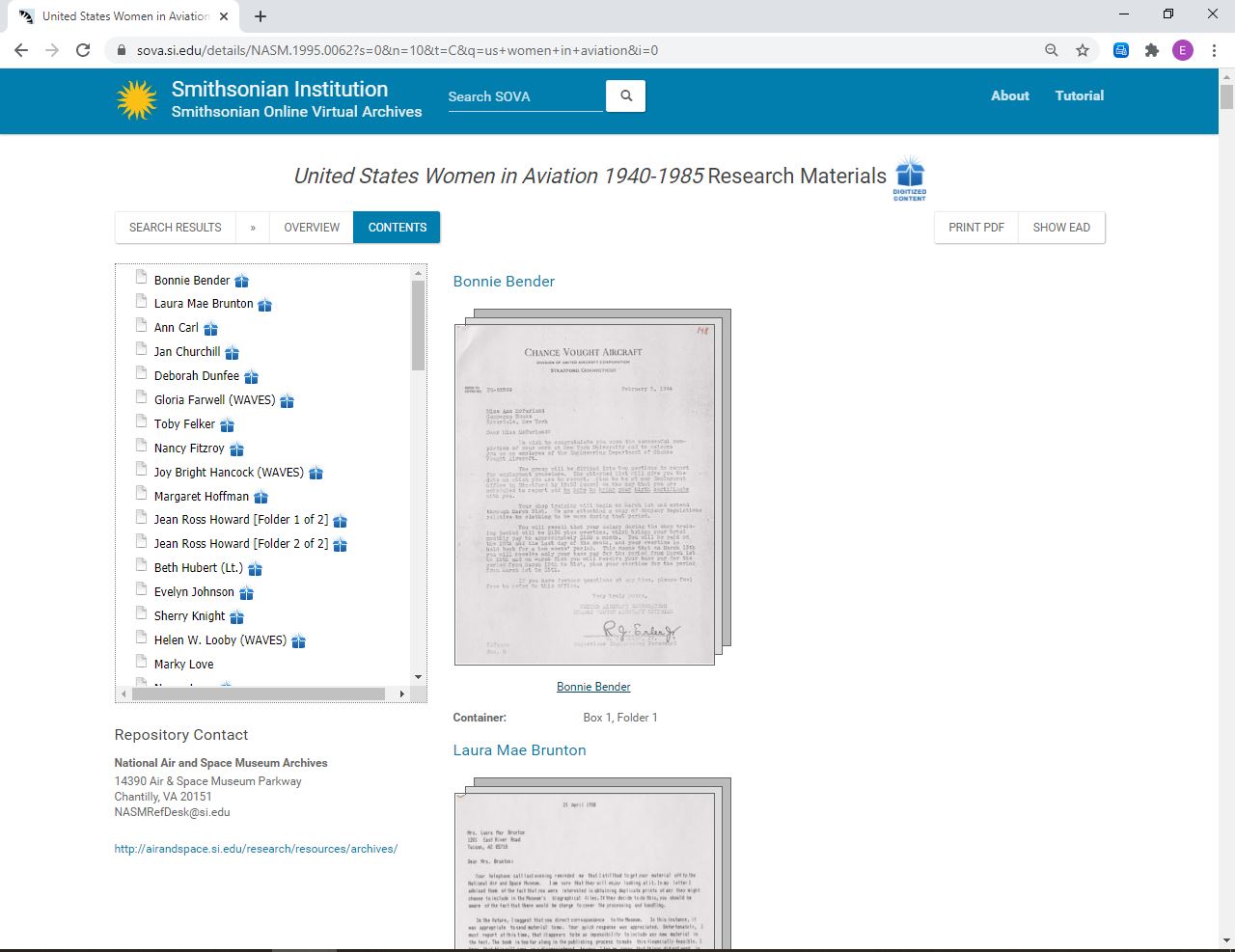 Screen capture of Smithsonian Online Virtual Archives (SOVA) Contents page for the United States Women in Aviation 1940-1985 Research Materials collection in the National Air and Space Museum Archives.