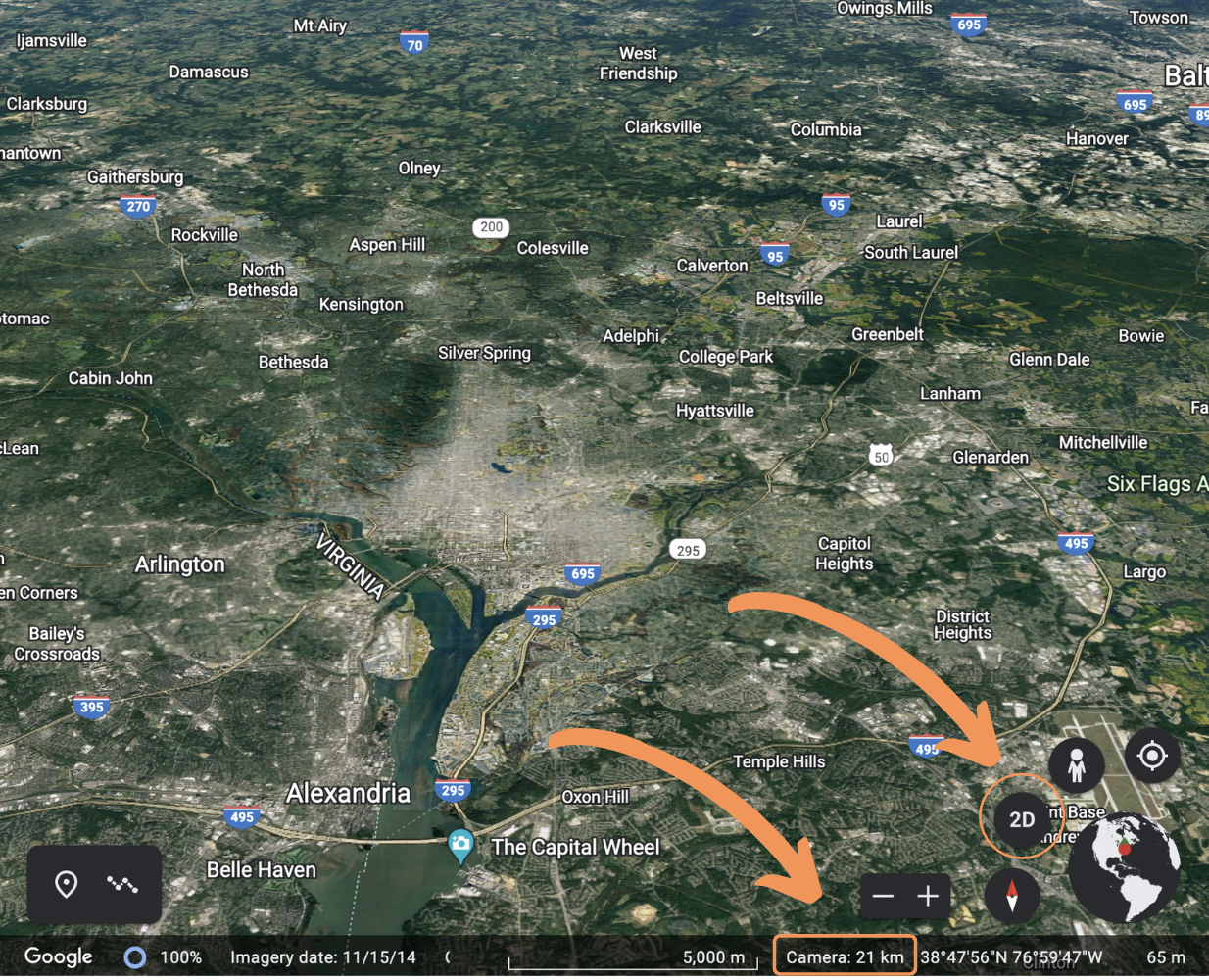 • A Google Maps overhead view. Camera 21 km is emphasized in the lower right hand corner, as is 2D.