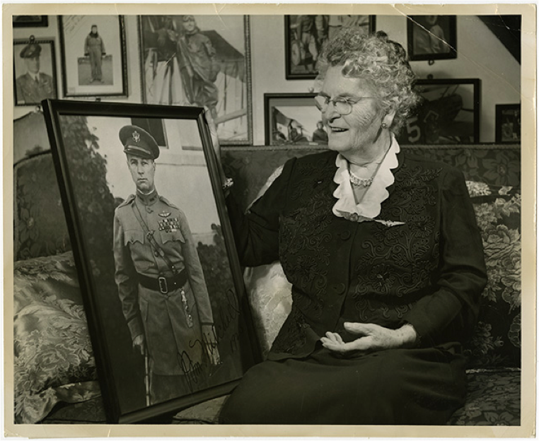 Informal photo of Mary E. “Mother” Tusch sitting on a couch at her home in Berkeley, California circa 1949. She is displaying an autographed photo of General William E. “Billy” Mitchell.