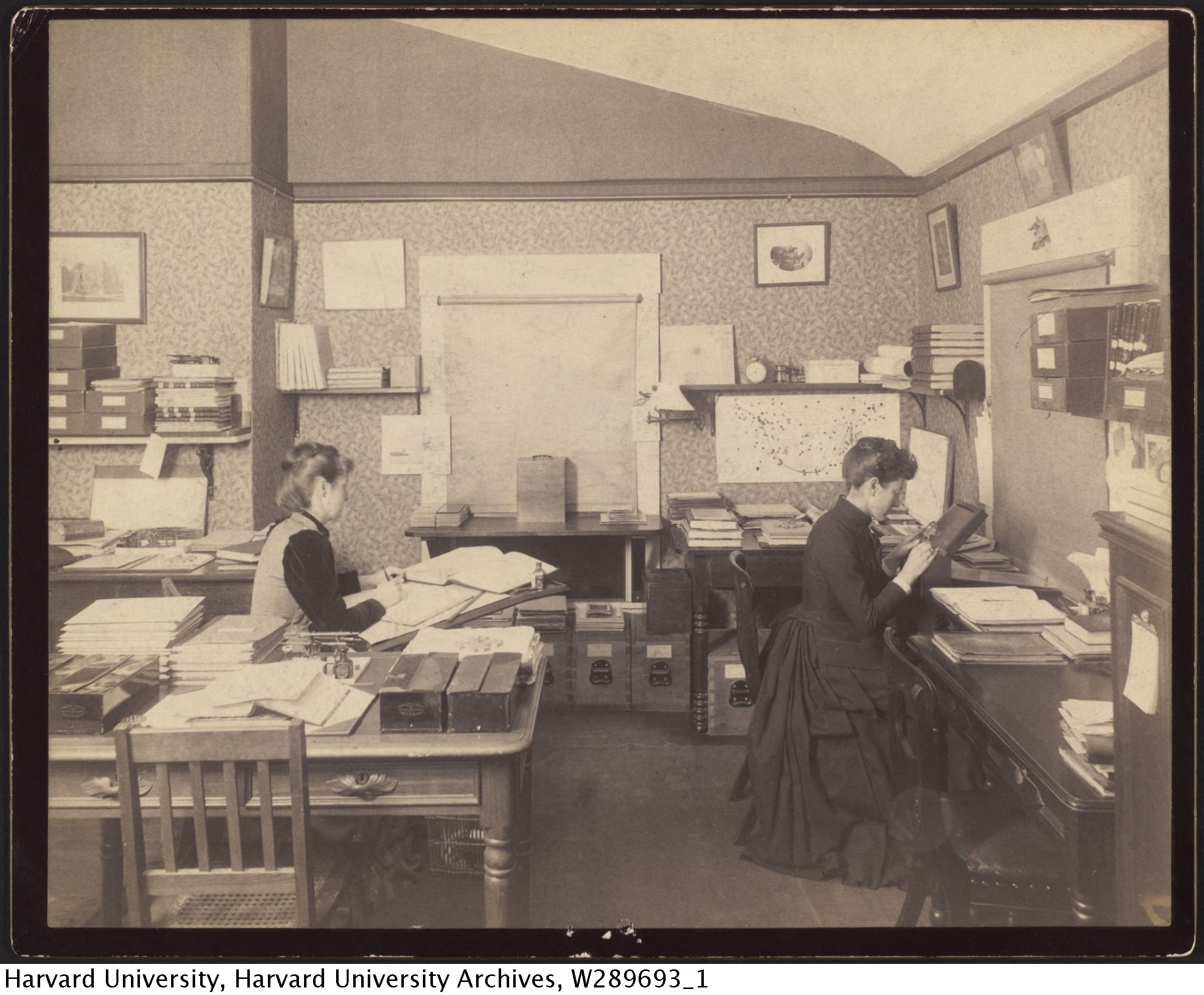 Two computers work together at the Harvard College Observatory, ca. 1891. At right, Williamina Fleming examines an astronomical glass plate. Her colleague, possibly Mabel C. Stevens, records Fleming’s observations and measurements in a notebook. (Courtesy of Harvard University Archives / HUV 1210 (9-6), Harvard Libraries, olvwork289693)
