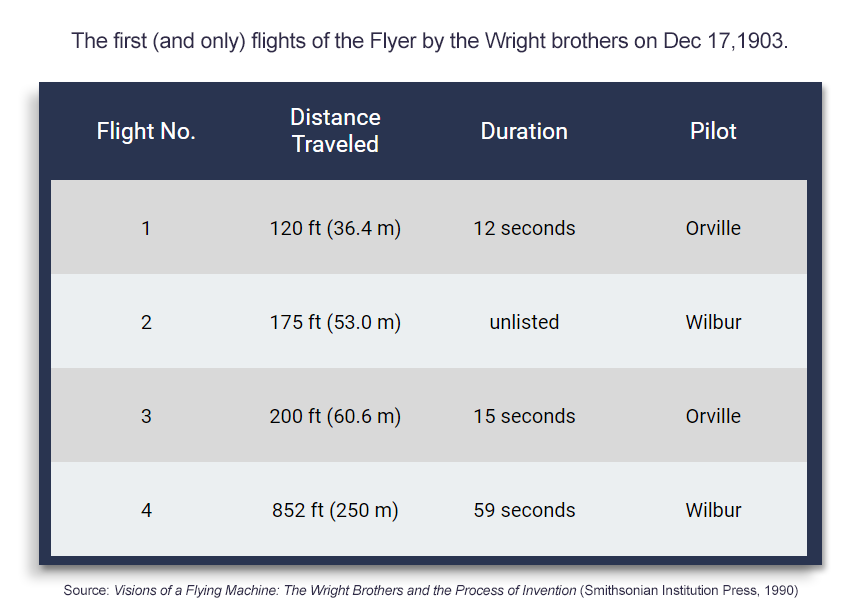 Information about the first (and only) flights of the Flyer by the Wright Brothers on Dec 17,1903. (Smithsonian Institution)