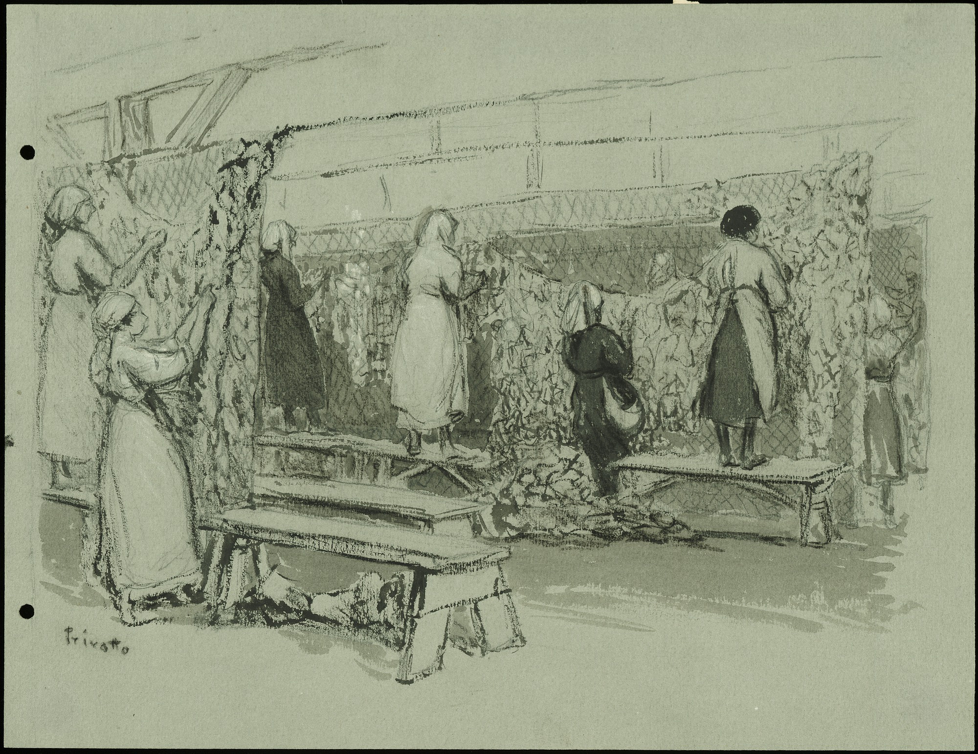 Tressing Nets for Artillery Emplacements by Ernest Clifford Peixotto | Pen and ink wash, and charcoal on paper, 1918